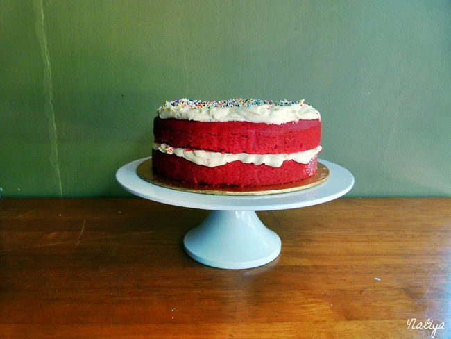 Hopped out of bed the next morning around 8, fresh-faced and ready to roll. Popped the batter in the oven, set my timer an extra 5 minutes, and watched some cartoons with my siblings. The cake came out perfectly this time around, I laid on the frosting (sparsely, as requested), and packed it up for delivery.