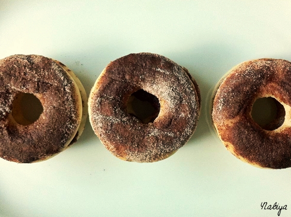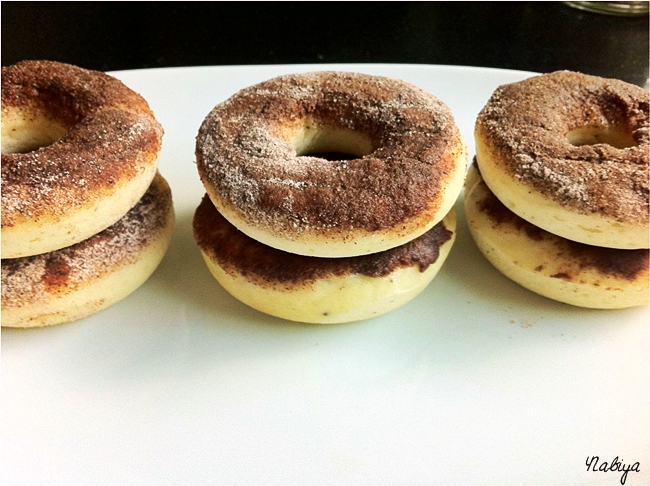 I had my aunt round for tea a few days ago and was messing about in the kitchen with all my baking utensils and decorative plates when I realized (quite belatedly) that there was a recipe on the packaging of the doughnut pan! Well, duh, Nabiya, it was right next to the pricetag… Which, I’m sure I looked at when I bought the damned thing.