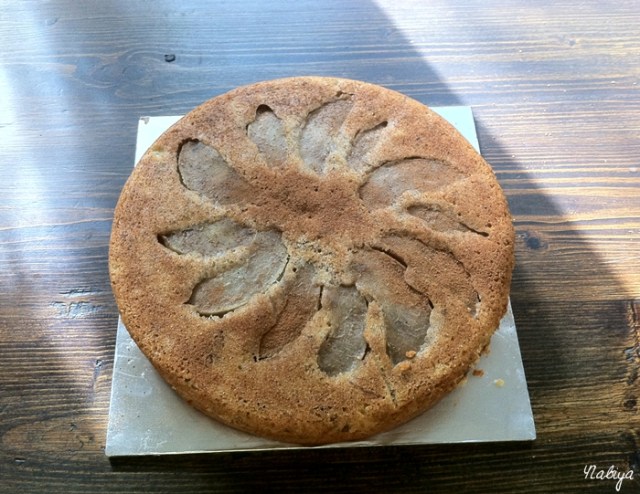 - Line the bottom of the baking tin with the pear slices, arrange as you like, then pour the cake batter over. Smooth the top and pop it in the oven for 40 minutes, or until a skewer poked through at an angle comes out clean