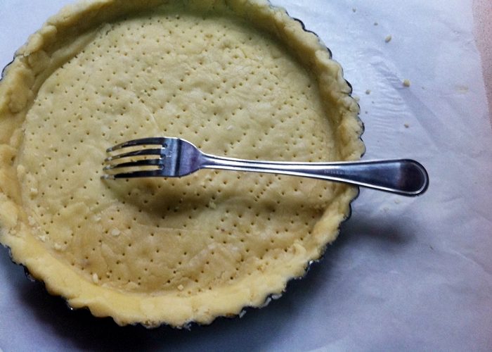 When ready to mold, roll the pastry flatter and turn it into the prepared pastry tin. Prick and bake for 15 minutes