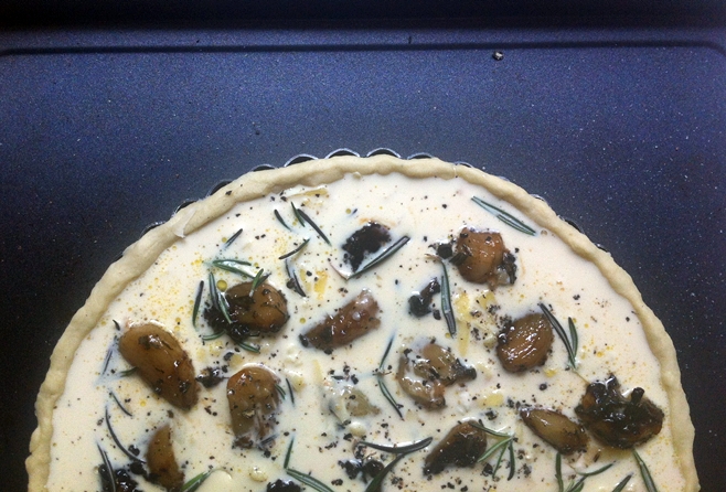 - Whisk all ingredients together and pour over the entire quiche mixture, then crack some extra pepper and scatter your rosemary leaves, and cover with the left over cheese. Pop into the oven, lower the temperature to 160C and bake for 45 minutes.