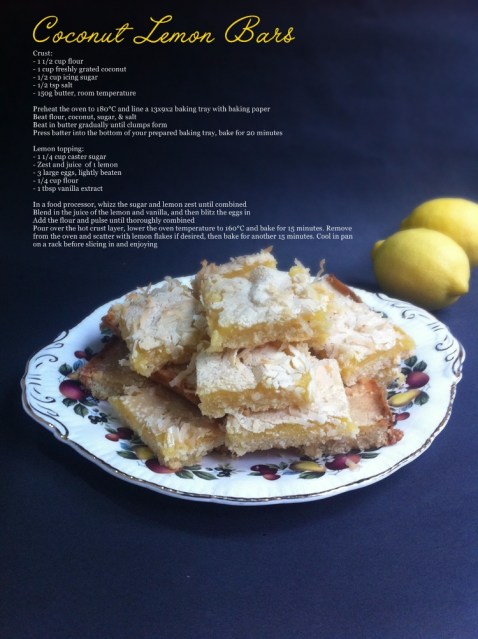 So, a lot of you have tried lemon slices, and lemon meringue pies, and key lime pies, and the such… but this was my first time pairing coconut and lemon, and I’m surprised that it worked as well as it did! Now I’m just thinking of other possible ways I can capitalise on this combo. Maybe a coconut cake with lemon curd? MMM Mother’s Day is coming up, I might just try that this weekend!