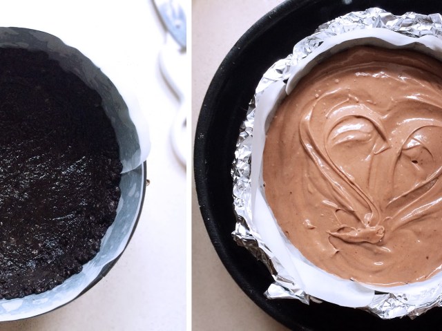 - Pour the cheesecake filling into the springform tin and smooth it out (or draw heart shapes with your spatula)