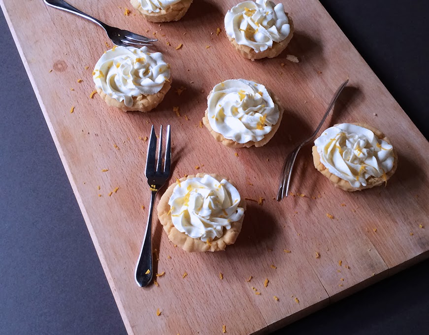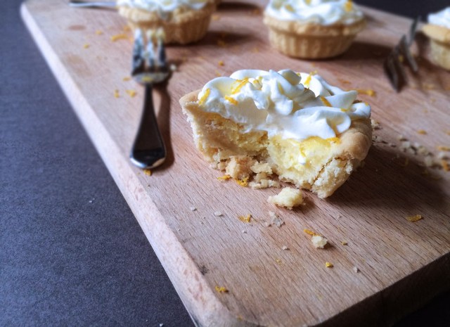 Whisk the double cream until soft peaks form, add the orange juice and continue to whisk until stiff peaks have formed. Then transfer the cream into a piping bag with a tip of your choice and pipe the cream out over the top of the tarts. Finish by grating the oranges (make sure you wash those babies) over the cream. You can also just dollop the cream on top of the tarts if you don’t feel like piping; what matters here is flavour, not aesthetics.