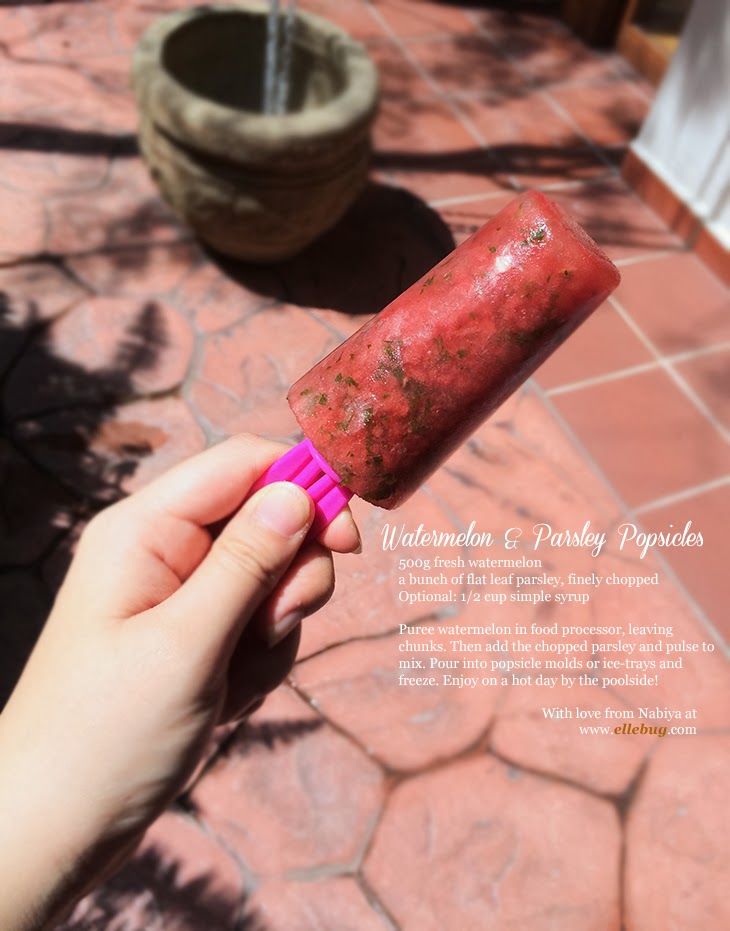 You can substitute the parsley with mint or basil, or leave it out entirely if you don’t want to and just have a watermelon popsicle. A simple syrup, if you feel that your watermelon isn’t sweet enough (though I’ll point out that watermelon tastes sweeter after it’s been frozen) is easy to make. Just boil 1 part caster sugar and 1 part water in a saucepan until the sugar granules have dissolved, let it cool then it’s ready to use. There’s no need for thickening or caramelising.
