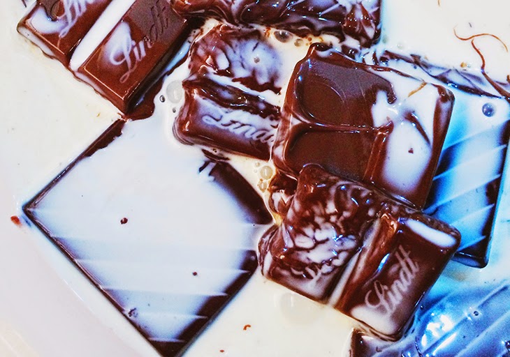 - Chop the chocolate and place in a medium sized heatproof bowl, pour the heated cream over the chocolate and let it sit for a few seconds before stirring with a spatula to melt it down. If necessary, put the bowl in the microwave for 20 seconds to reheat