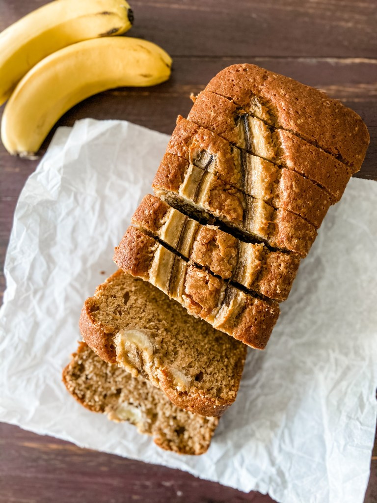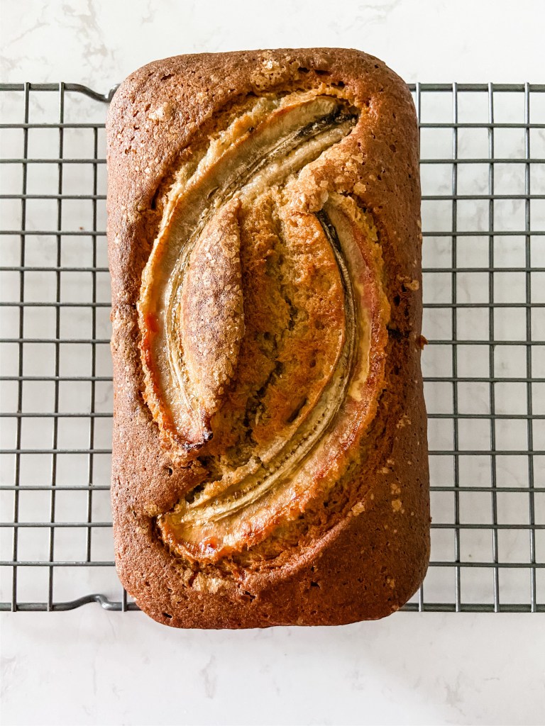 6. Pour the batter into the prepared loaf tin, if you’re feeling decorative and have a banana to spare, slice one down the middle lengthwise and place them on top of the batter. Sprinkle some brown sugar on top, and bake for 40-50 minutes. Remove when a skewer inserted through the top at an angle comes out clean (or there are only a few dry crumbs on there). Let the banana bread cool in the tin for 10 minutes, then remove onto a wire rack to cool completely.