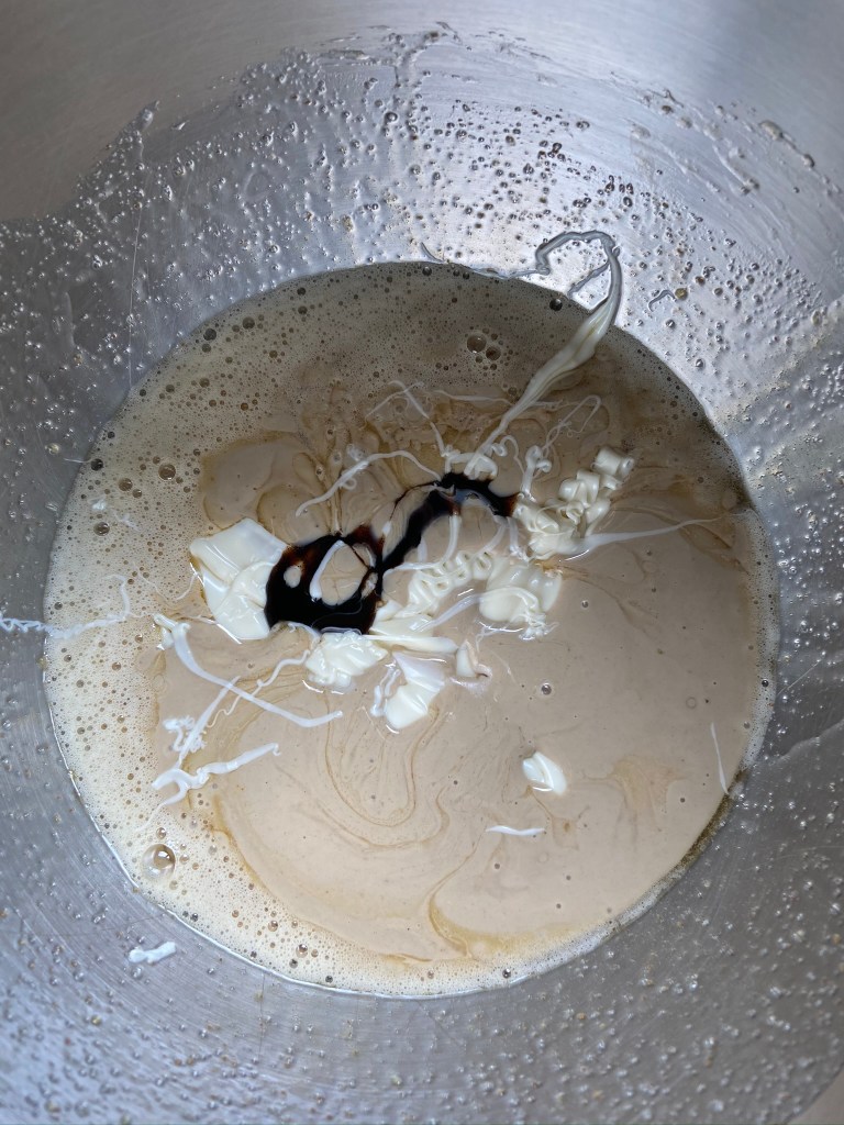 - Add the tahini, melted white chocolate and vanilla bean paste and beat again to combine
